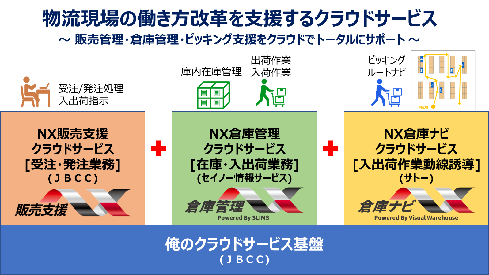 物流業界における問題の解決を目指し、数多くの業務開発の実績があるJBCCと、西濃運輸のグループ会社として培った業務知識や技術で物流ITサービスを提供するセイノー情報サービス、現場で人やモノの動きと情報をつなぐ自動認識ソリューションを手掛けるサトーの3社がそれぞれの強みを活かし、JBCCのEcoシステムクラウドサービス「俺のクラウド」のラインナップに、セイノー情報サービスの倉庫管理システム「SLIMS」と、サトーの庫内業務改善ソリューション「Visual Warehouse」を新たに加え、運用付きクラウドサービスとして提供します。既にサービス中の「NX販売支援」とも連携し、受注処理から入出荷作業まで、物流業務をトータルにサポートします。